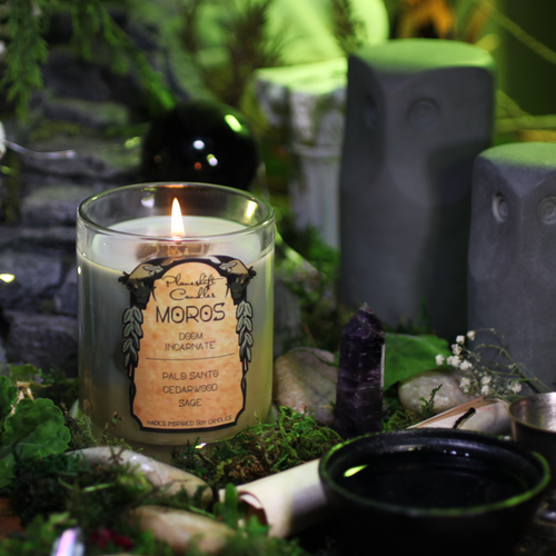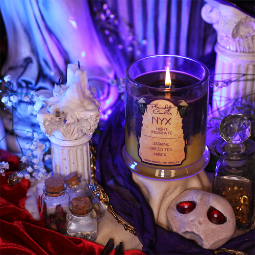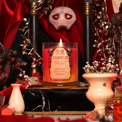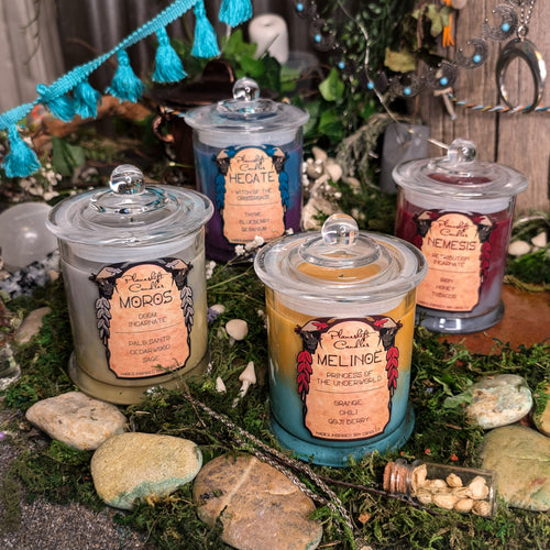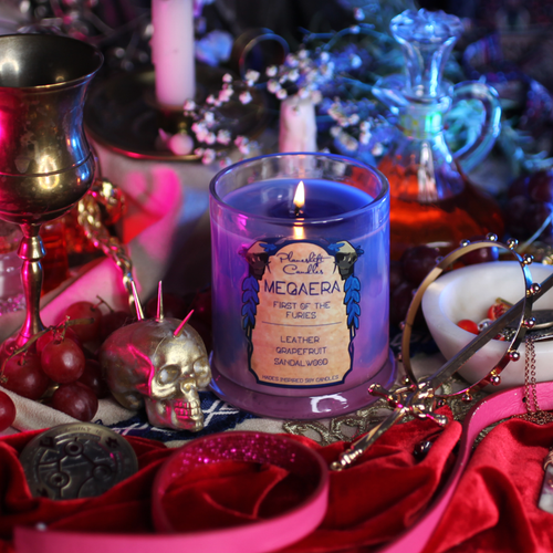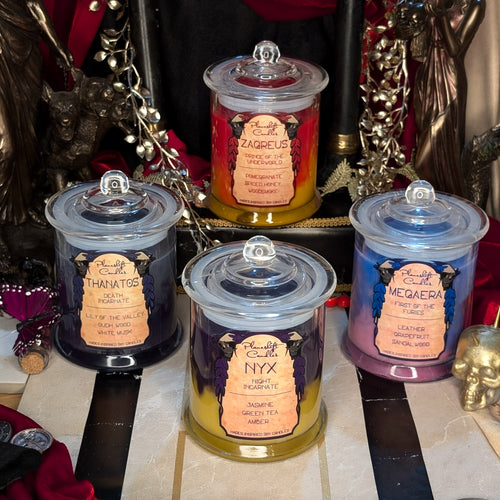 A short run collection of 100% soy wax candles inspired by the roguelike action-RPGs, Hades and Hades II by Supergiant Games. Each candle is inspired by a different character met in the series, with colour and scent from their design, theming, and personality. These are fan made and not affiliated with Supergiant Games.